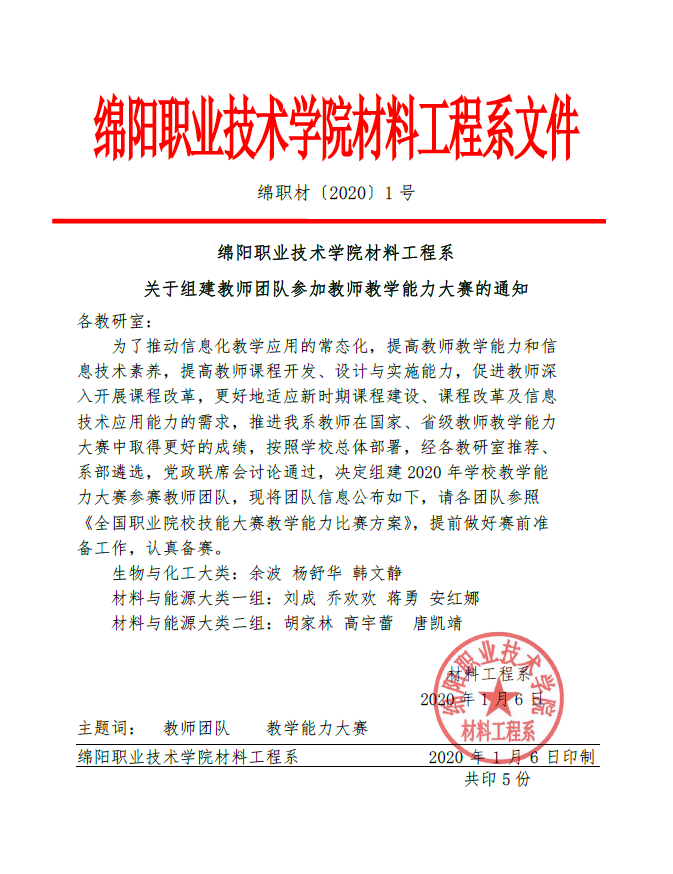 材料工程系关于组建教师团队参加教师教学能力大赛的通知