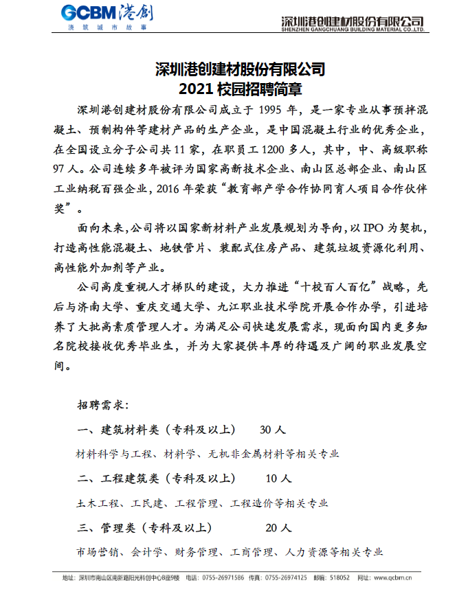 上一条:深圳市龙岗大工业区混凝土有限公司招聘简章