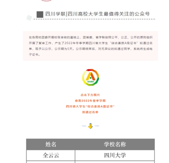 根据共青团四川省委、四川省员工联合会《关于开展2022年四川省老员工冬季学期“综合素质A级证书”认证工作的通知》文件要求,经本人申请、各院初审、学校初评、团省委、省学联复核,公司有89名员工获得四川省老员工“综合素质A级证书”,其中,williamhill威廉希尔官网“菁英”班同学在学院及领导的全力培养下,有袁晗等40位同学获得此证书,较去年秋季增长了35名同学,同比增长率高达700%。