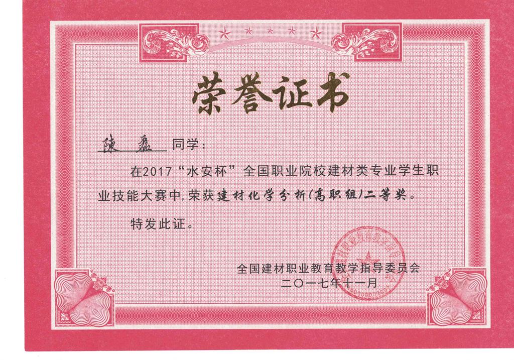 陈磊在2017“水安杯”全国职业院校建材类专业员工职业技能大赛中,荣获建材化学分析二等奖