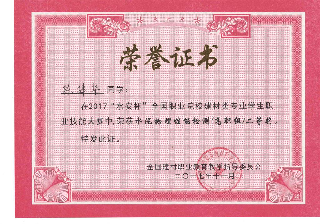 陈建华在2017“水安杯”全国职业院校建材类专业员工职业技能大赛中,荣获水泥物理性能检测二等奖