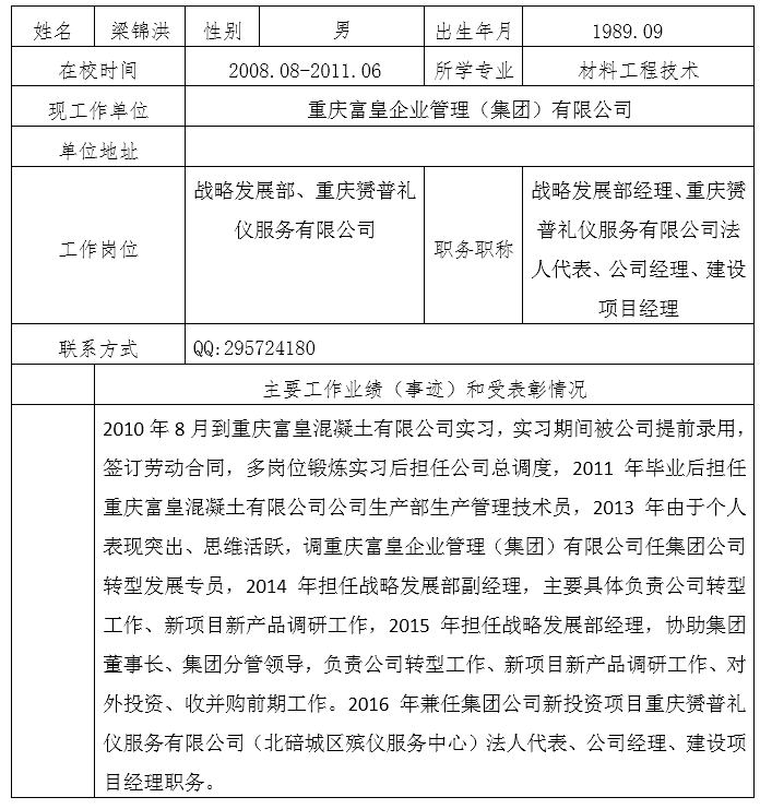 优秀员工—重庆富皇企业管理(集团)有限公司战略发展部经理、重庆赟普礼仪服务有限公司法人代表、公司经理、建设项目经理梁锦洪