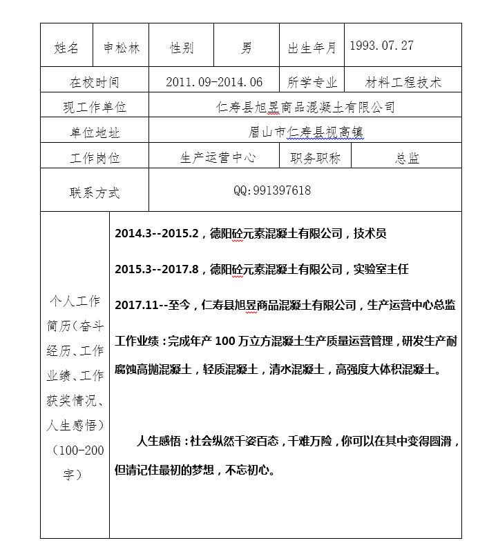 优秀员工—仁寿县旭昱商品混凝土有限公司生产运营总监申松林