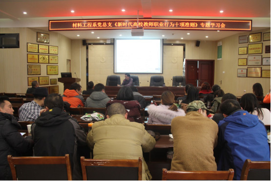 为深入贯彻习近平新时代中国特色社会主义思想和党的十九大精神,深入贯彻落实全国教育大会精神,扎实推进《中共中央 国务院关于全面深化新时代教师队伍建设改革的意见》的实施,进一步加强师德师风建设,按照公司党委组织的要求,材料工程系党总支于12月26日在崇实楼202会议室举行了《新时代高校教师职业行为十项准则》专题学习会,材料工程系全体教职工参加了专题学习会,材料工程系党总支书记豆祎主持了本次活动。