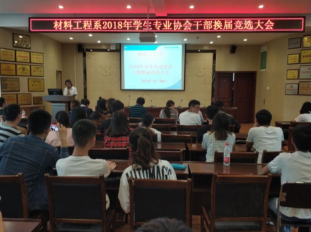 2018年9月28日下午,材料工程系在崇实楼二楼会议室举行2018年员工专业协会干部换届竞选大会。材料工程系党总支书记豆祎、员工党支部书记王昱程、材料工程系团总支书记肖薇、材料系刘侨、王启强、王燕、杨娟等老师出席会议并担任评委。材料工程系团学干部、协会负责人参与了会议。