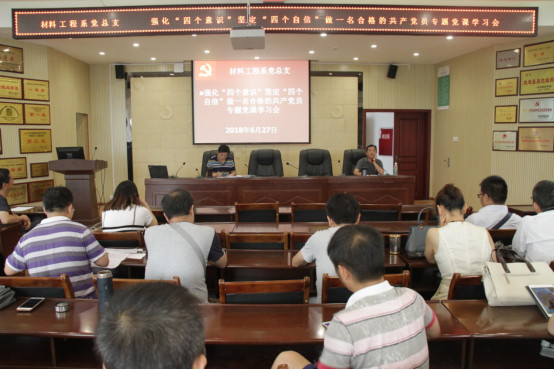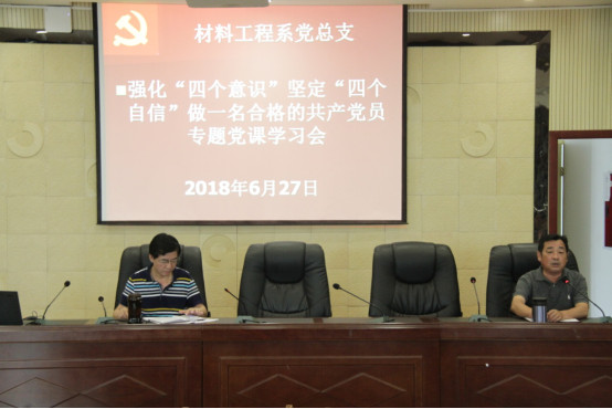 为深入学习贯彻习近平新时代中国特色社会主义思想和党的十九大精神,继承和发扬党的优良传统,进一步提高各级党组织的凝集力、号召力和战斗力,着力增强广大党员的荣誉感和责任感,在庆祝建党97周年来临之际,6月27日下午,材料工程系党总支在崇实楼二楼会议室举行了强化“四个意识”坚定“四个自信”做一名合格的共产党员专题党课学习会。材料工程系全体教职工党员参加了专题党课学习,党总支书记豆祎为全体教职工党员上了强化“四个意识”坚定“四个自信”做一名合格的共产党员专题党课。