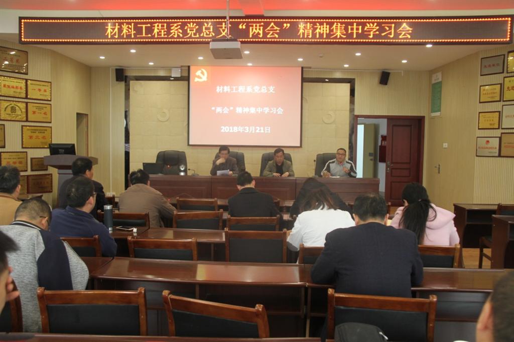 十三届全国人大一次会议和全国政协十三届一次会议分别于3月5日和3月3日在北京开幕以来,受到了举国关注,举世瞩目。2018年是全面贯彻党的十九大精神的开局之年,是改革开放40周年,是决胜全面建成小康社会、实施“十三五”规划承上启下的关键一年。刚刚闭幕的2018年全国两会,也是新一届全国人大和全国政协的首次会议,是关键时时间节点的关键会议。为了使材料工程系全体教职工对今年的“两会”精神有更深刻的理解,材料工程系党总支于3月21日下午,在崇实楼材料系会议室举行了“两会”精神集中学习会。材料工程系全体教职工参加了本次集中学习会,材料工程系党总支教工党支部书记贾陆军主持了集中学习活动。