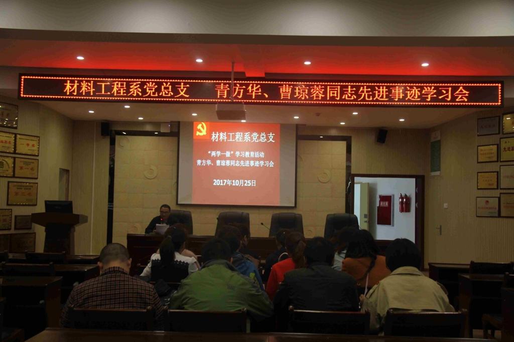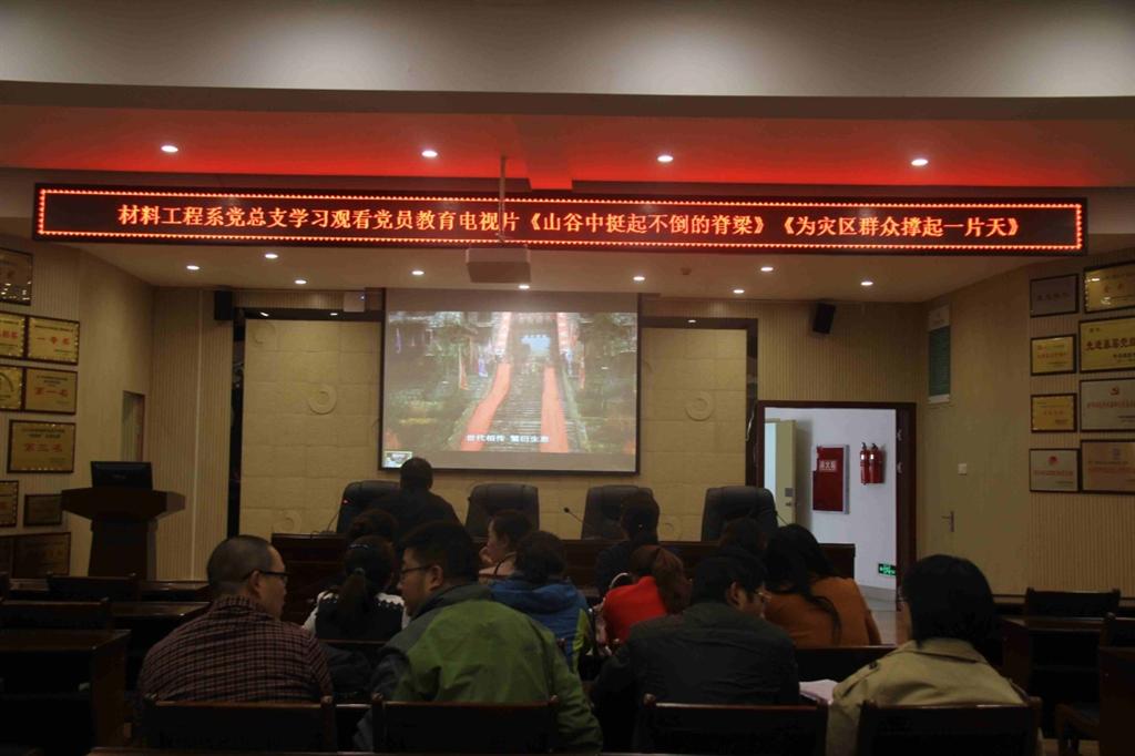 10月25日下午,材料工程系党总支在崇实楼二楼会议室组织全体党员教师学习观看《山谷中挺起不倒的脊梁》、《为灾区群众撑起一片天》党员教育电视片和学习青方华、曹琼蓉同志先进事迹学习会。材料系全体党员参加了学习会,教工党支部书记贾陆军主持了本次学习会。