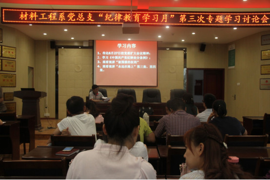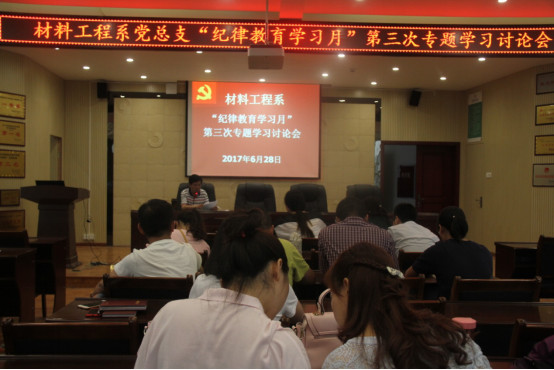 6月28日,材料工程系党总支组织全系党员在崇实楼系会议室举行“纪律教育学习月”第三次专题学习讨论会。党总支副书记豆祎主持了学习。