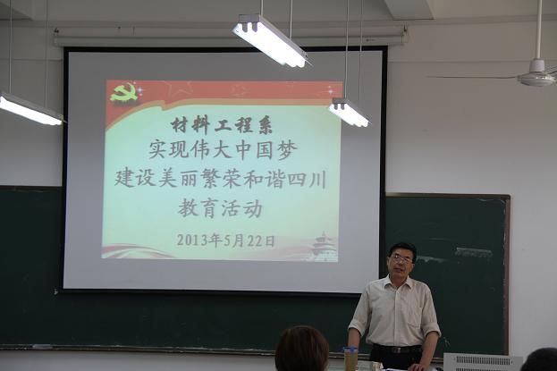 2013年5月22日下午2:30,材料工程系党总支在崇实楼B204召开教职工会,开展“实现伟大中国梦,建设美丽繁荣和谐四川”主题教育活动。大会由党总支副书记史玉平主持,教职工全员参加了本次教育大会。