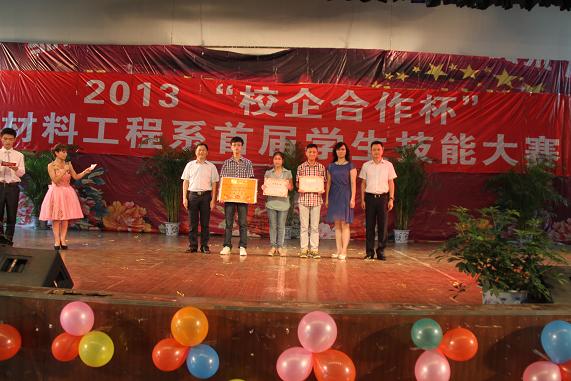2013年7月3日下午,以“实现中国梦、培养高端技能型人才,为80周年校庆献礼”为背景,以“校企合作、崇德尚能”为主题,以丰富校园文化、提高职业能力为目标的材料工程系首届“校企合作杯”员工专业技能大赛颁奖暨闭幕式在学院学术报告厅举行,公司党委常委、副经理左明扬,学院科技合作处处长黄泽森,四川银河化学股份有限公司副部经理陈宁及技术中心与项目发展部长董明甫、人力资源部长魏显德、机械制造公司副部经理唐家银,四川旭虹光电科技有限公司人力资源部高级人力资源管理师梁巧娟,成都精准混凝土有限公司材料部长、我系2013届毕业生陈露等应邀参加了颁奖暨闭幕式。在颁奖暨闭幕式举行前,嘉宾们还应邀参观了我系分析检测中心和材料制备与控制中心.
