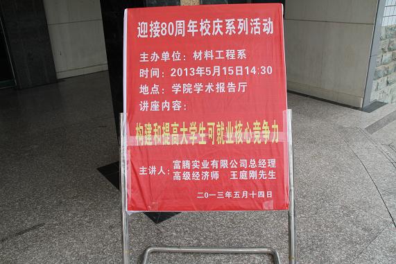 2013年5月15日下午,应材料工程系的邀请,绵阳市安县工业园区管委员副主任、富腾实业人限公司总经理、高级经济师王庭刚先生在学院学术报告厅为材料工程系师生作了 “构建和提高老员工可就业核心竞争力”的报告。材料工程系师生600多人聆听了报告。