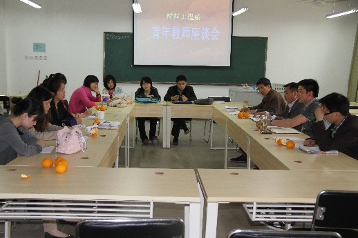 材料工程系于2012年4月5日下午在崇实楼 B204教室召开青年教师座谈会,副主任杨峰、总支副书记史玉平、主任助理吴洪和11名青年教师参加了会议。会议的主题是“青年与责任,改革与发展。”
