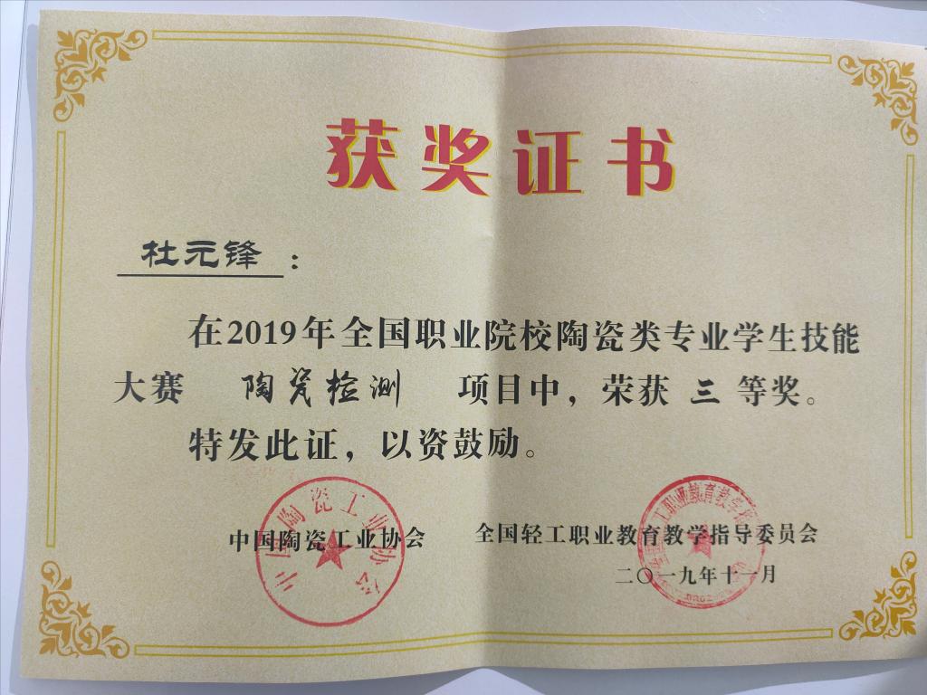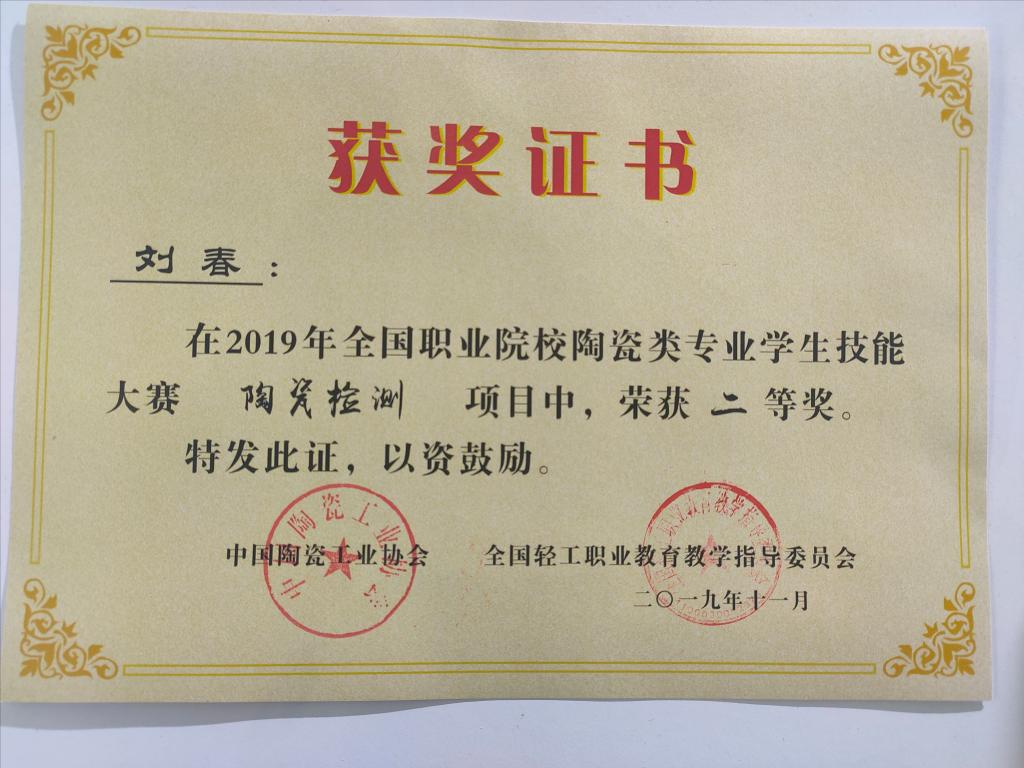最终经过激烈的技能角逐,刘春同学荣获“陶瓷检测”比赛的二等奖,杜元锋同学荣获“陶瓷检测”比赛的三等奖,梅朝鲜老师获“优秀指导老教师”奖。