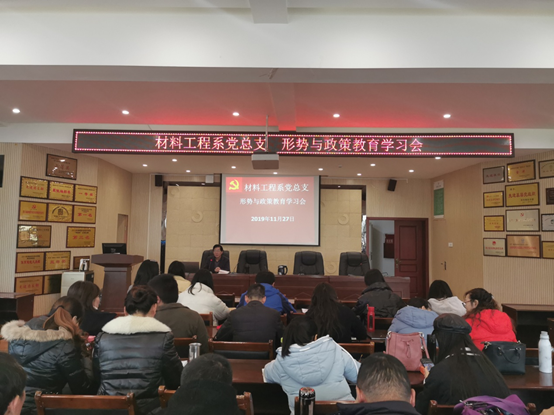 为深入学习习近平新时代中国特色社会主义思想,贯彻习近平总书记关于“不忘初心、牢记使命”主题教育的重要讲话和重要指示批示精神,根据《中共威廉希尔足球官网委员会关于开展“不忘初心、牢记使命”主题教育的实施方案》(绵职公司党发﹝2019﹞51号文)的部署和安排,结合我系实际。11月27日中午,材料工程系党总支在崇实楼202会议室开展了形势与政策教育学习会。材料工程系全体教职工、部分员工党员、员工入党积极分子参加了本次学习。材料工程系党总支书记豆祎主持了本次学习会。