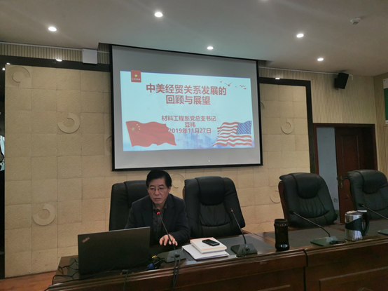会上,豆祎以《中美经贸关系发展的回顾与展望》为题,借助实例,深度剖析,分别就“中美经贸关系发展的阶段性特征”“40年来中美经贸关系所取得的成就”“中美经贸关系面临的问题”“中美贸易摩擦产生的消极影响”“中国的解决立场及应对方案”等方面内容向参会的师生们开展了一堂生动形象的形势与政策课,更为直接的帮助师生了解了中美两国之间的贸易关系发展历程。