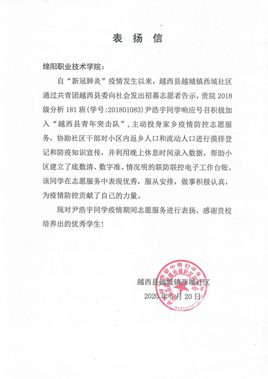 近日,我系收到一封来自共青团越西县委、越西县越城镇西城社区的感谢信,对公司材料工程系分析181班员工尹浩宇勇敢逆行、积极主动参与越西县疫情防控志愿服务工作表示感谢。来信充分肯定了尹浩宇作为一名绵职学子的责任与担当,对公司对其进行的教育和培养表示感谢。