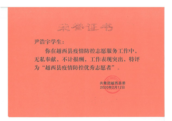 新冠肺炎疫情发生后,尹浩宇作为一名返乡老员工,主动找到社区报名,自愿加入到疫情防控和宣传工作中,负责小区防控,做好出入登记,并利用晚上休息时间录入数据,帮助小区建立了底数清、数字准、情况明的联防联控电子工作台账。平时,对于不理解疫情防控的群众,他总是耐心地宣传防控政策及卫生防疫知识,为社区居民答疑解惑;对于需要帮助的老人,尹浩宇总是第一个冲在前面,为需要帮助的人解决实际困难。据其辅导员介绍,尹浩宇在校期间学习成绩良好,担任班级文艺委员,他乐于助人,在校期间就多次参加社会志愿服务活动。