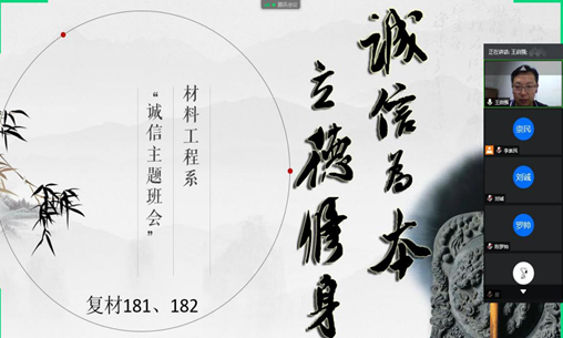 6月15日-6月24日,材料工程系17-18级本科班、18-19级专科班共计23个班级共计1500余名员工参加了有各班辅导员主持召开的题为“诚信为本,立德修身”主题教育线上班会,并通过设计诚信宣传画、组织线上诚信观影、讲诚信故事等多种形式开展此次诚信教育主题活动。活动贴近实际、贴近生活、贴近员工。此外,各班还从诚信考试、诚信还款、远离不良贷、套路贷等方面,开展一系列警示教育宣传活动。
