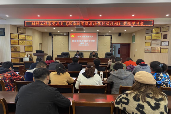 为贯彻落实《职业教育提质培优行动计划》,办好公平有质量、类型特色突出的职业教育,10月28日下午,材料工程系党总支在崇实楼202会议室开展了“职业教育提质培优行动计划”专题学习会。材料工程系全体教师参加了本次专题学习会。材料工程系党总支书记豆祎主持了本次学习会。