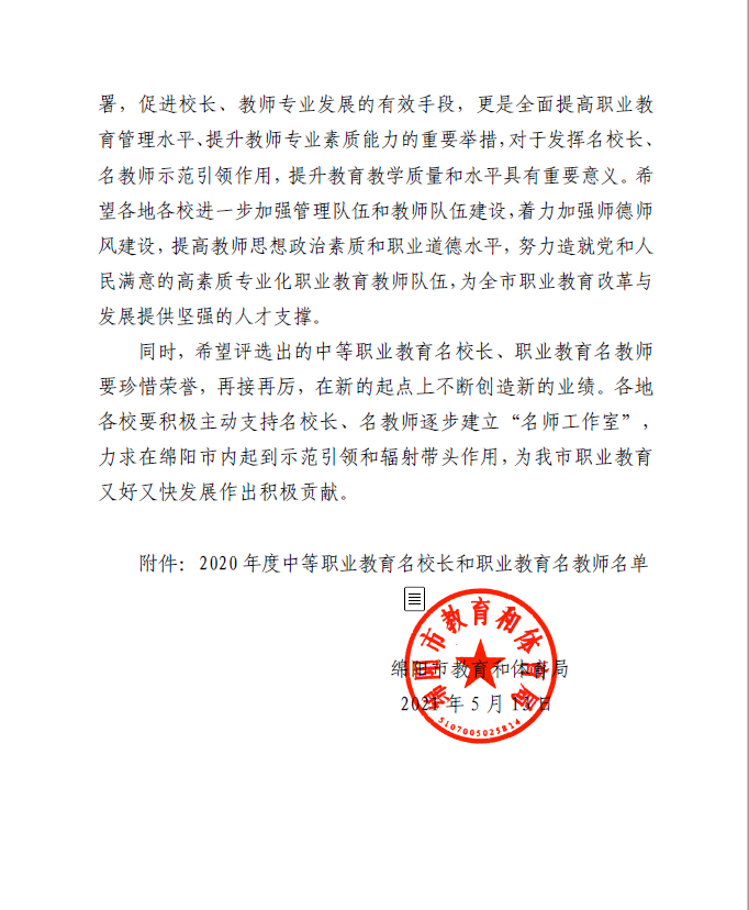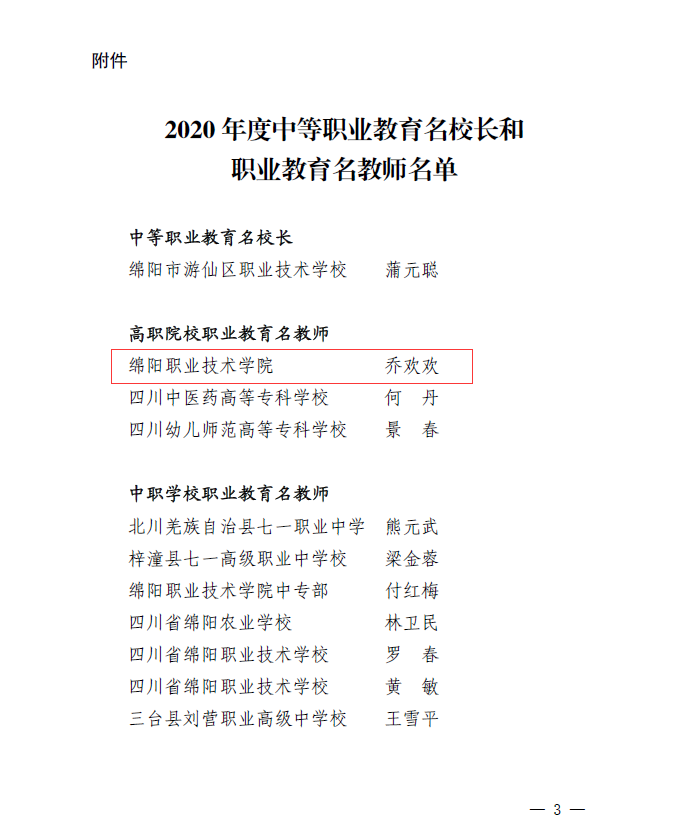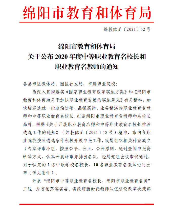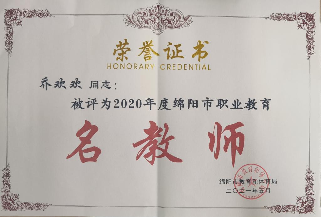 为深入贯彻习近平总书记关于教育工作的重要论述和全国职业教育大会上对职业教育的重要指示精神,落实国家《职业教育改革实施方案》,加快培养造就一批政治过硬、品德高尚、业务精湛的职业教育名师,打造绵阳市职业教育名师和名董事长品牌。根据《绵阳市教育和体育局关于加快职业教育发展的实施意见》有关精神,绵阳市教育和体育局开展了2020年度绵阳市职业教育名师和中等职业教育名董事长推荐遴选工作。经专家评审,2021年5月20日,在2021年绵阳市职业教育与成人教育工作会议上揭晓了2020年度绵阳市中等职业教育名董事长和职业教育名教师的获奖名单。公司乔欢欢老师荣获2020年度绵阳市职业教育名教师。
