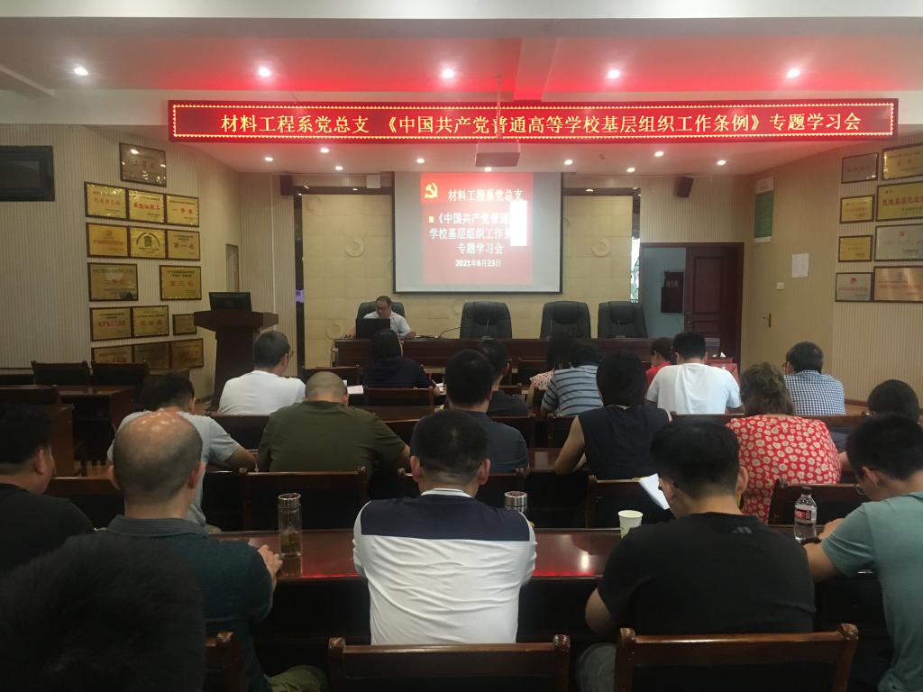 为深入贯彻党的十九大和十九届二中、三中、四中、五中全会精神,以党章为根本依据,落实新时代党的建设总要求和新时代党的组织路线,全面贯彻党的路线方针政策,坚持和加强党对普通高等学校的全面领导,加强和改进高公司党的建设,扎根中国大地办好中国特色社会主义大学,落实立德树人根本任务,建设高质量基层党组织。6月23日下午,材料工程系组织全体党员教师在材料大楼202会议室举行了《中国共产党普通高等学校基层组织工作条例》专题学习会,材料工程系教工第二党支部书记、系副主任贾陆军主持了本次学习活动。