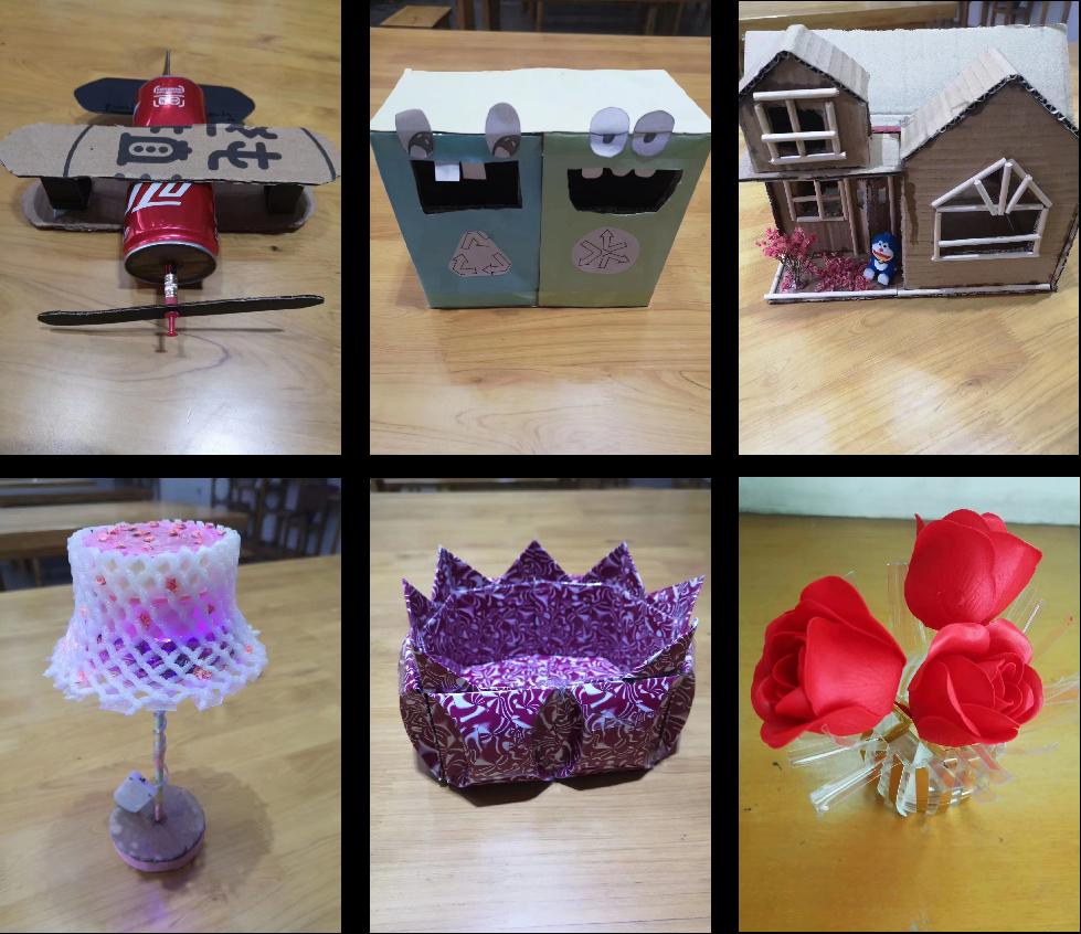 在这次活动中,同学们走入生活、走入社会,用智慧的双眼去找寻资源的浪费,并以自己独特的方式表达出来,制作出自己喜欢的作品。利用身边废弃的物品,充分发挥出自己丰富的想象力和创造力,创造出具有观赏价值或具有实用价值的作品,让人耳目一新,打破局限性思维,勇于创作,积极向上。同学们搜集自己平时用不到的废瓶子、纸杯、纸盒等,并对它们进行完美的华丽大改造,达到变废为宝的主题意图。整个过程中,同学们积极参与、发现、思考,真正享受了“变废为宝”的快乐和收获。