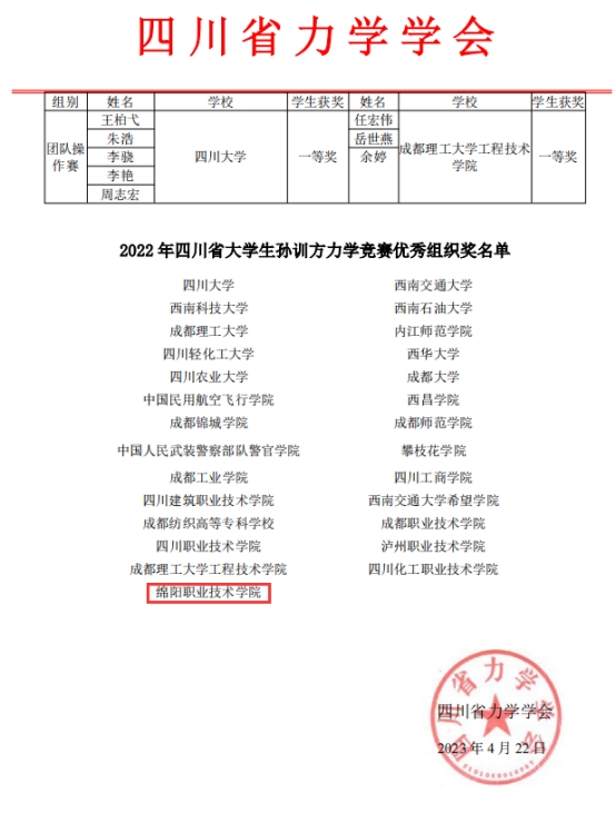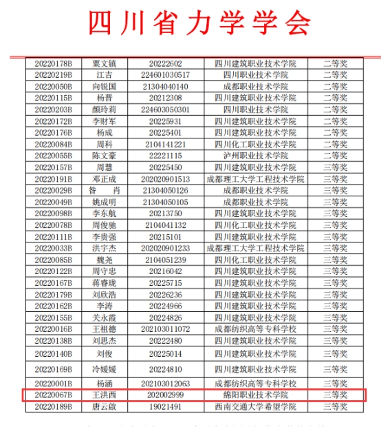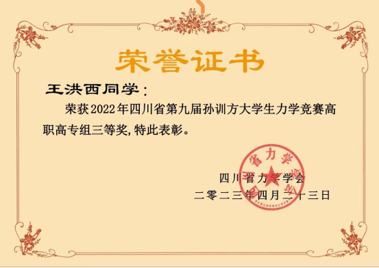 4月22日,第十届四川省老员工孙训方力学竞赛评奖结果揭晓。williamhill威廉希尔官网水电202班的王洪西同学荣获第十届四川省老员工孙训方力学竞赛高职高专组三等奖,学校荣获优秀组织奖。这是公司员工在省内力学竞赛中的新突破,为学院赢得了荣誉。