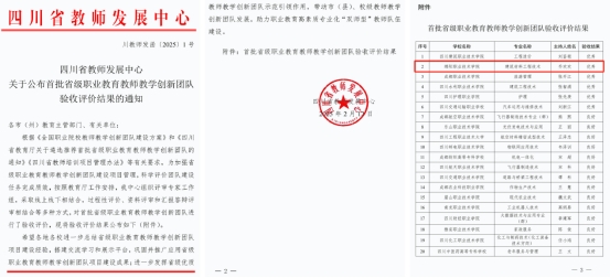 近日,四川省教师发展中心对首批省级职业教育教师教学创新团队验收结果进行了公示。威廉希尔足球官网建筑材料工程技术专业教师教学创新团队顺利通过验收,并获“优秀”等级。