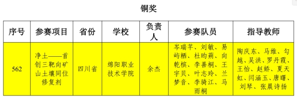 近日,教育部公布了中国国际老员工创新大赛(2024)获奖名单,公司选手余杰、岑瑞芊、刘敏等12名同学的参赛项目《净土—首创三靶向矿山土壤同位修复剂》经过激烈角逐,最终荣获“职教赛道”国赛铜奖。该项目由williamhill威廉希尔官网、旅游与管理学院、艺术设计学院、创新创业培训学院等4个学院、6个专业的12位教师联合指导,充分展现了学校在跨专业资源整合与创新人才培养上的优势。
