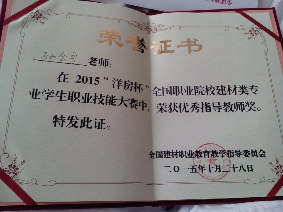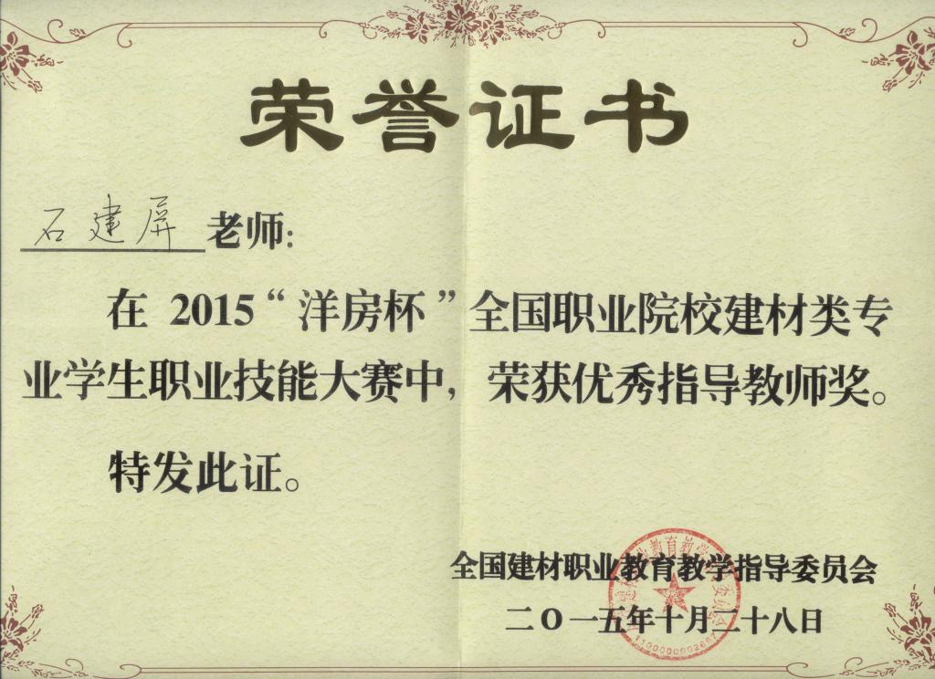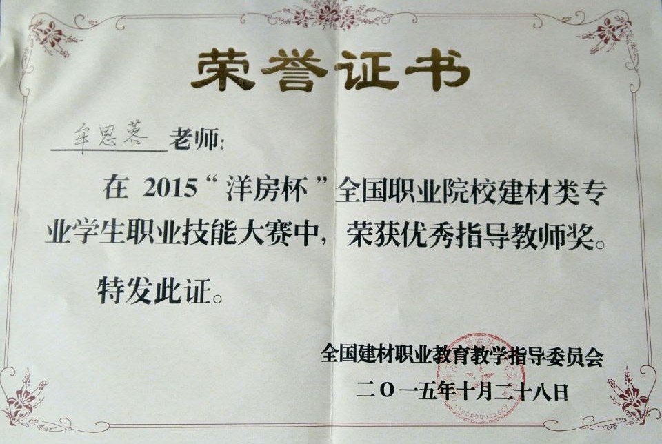 2015年“洋房杯”全国职业院校建材类专业员工职业技能大赛教师获奖证书
