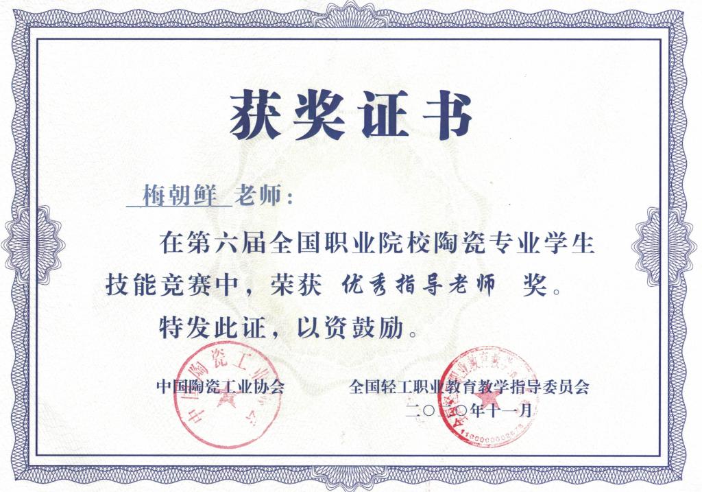 2020全国职业院校陶瓷类专业技能大赛指导教师证书(梅朝鲜)
