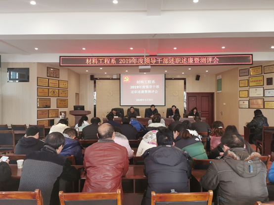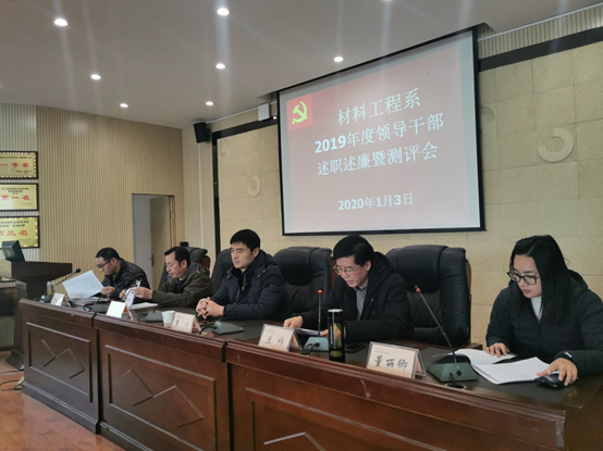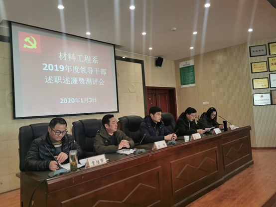 为深入学习贯彻习近平总书记关于“不忘初心、牢记使命”主题教育的重要讲话和重要指示批示精神,全面客观准确评价系部领导班子成员2019年度履职情况和重点任务完成情况,总结经验,查找不足,切实增强材料工程系领导班子的履职能力,推动2020年各项工作扎实开展。2020年1月3日中午材料工程系在崇实楼202会议室召开了2019年度领导干部述职述廉暨测评会。学校纪委委员、信息工程系党总支书记李川代表学校纪委参加了测评会,材料工程系主任杨峰,副主任贾陆军,综合办主任董丽卿,材料工程系党总支书记豆祎以及材料工程系全体教师参加了本次测评会。豆祎主持了本次述职述廉暨测评会。