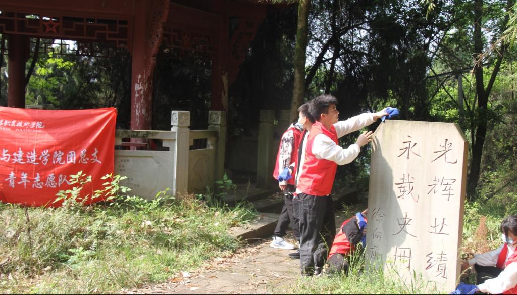 青年志愿服务队的全体队员在革命先烈墓碑四周进行祭扫活动。队员们拿扫帚将堆积的落叶和尘土一一扫净,用毛巾擦去墓碑上的浮尘,为英烈营造干净整洁的安息之所。