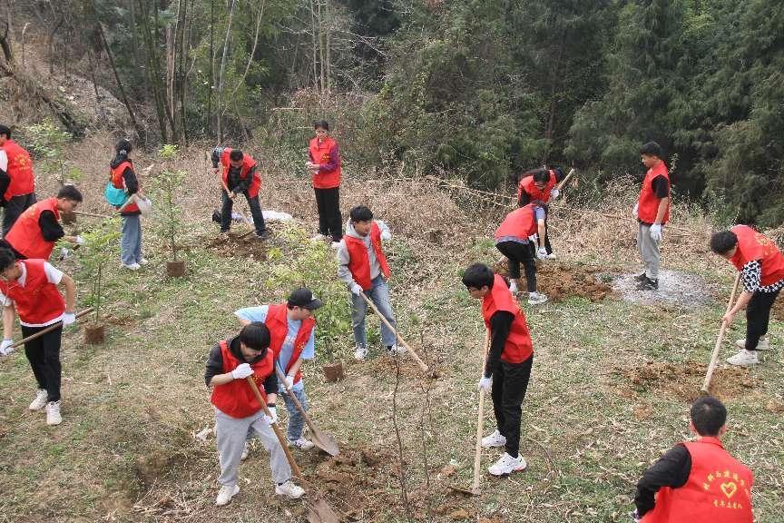 在植树现场,师生们个个热情高涨、干劲十足,二三人一组,分工合作,配合默契,挖坑、扶苗、填土、踩实、施肥……协同配合认真栽种,为大地增添一抹新绿的同时也为帮扶村改良土地生态、推动产业结构绿色调整贡献力量。