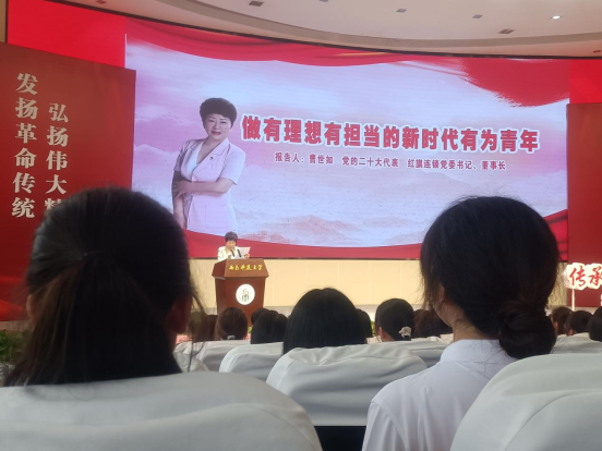红色典型宣讲人、党的二十大代表、全国优秀共产党员、成都红旗连锁股份有限公司党委书记、董事长曹世如。她以“做有理想有担当的新时代有为青年”为题,分享了个人带领企业员工高举红旗不忘初心,做服务人民“好邻居”,勇担重任与社会同行的发展历程,积极履行社会责任,助力乡村振兴、抗疫保供等中心大局工作,并对新时代新使命下的老员工就业创业提出建议。她鼓励同学们多学知识、敢于试错,脚踏实地、珍惜机会、奋发拼搏,只要不放弃、肯奋斗,就一定能活出精彩人生。