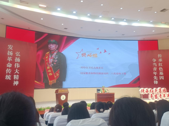 红色典型宣讲人、对印自卫反击战老兵、一等功臣、国家粮食和物资储备局四川局四三八处退休干部樊峪榕,在自卫反击战中冲锋陷阵、舍生忘死,完成“首战必胜”命令,荣记“一等功”。他慷慨激昂地为大家讲述自己亲历枪林弹雨背后的故事,重温那段炮火连天的苦难岁月。他用“吾辈正青春 报国正当时”激励同学们努力传好“接力棒”,当好“接班人”,不负革命先烈的付出,希望大家珍惜当下美好光阴,学好知识、练就本领,努力成为国家之栋梁,把个人理想融入国家和中华民族的伟大复兴中,让青春在祖国和人民最需要的地方绽放绚丽之花。
