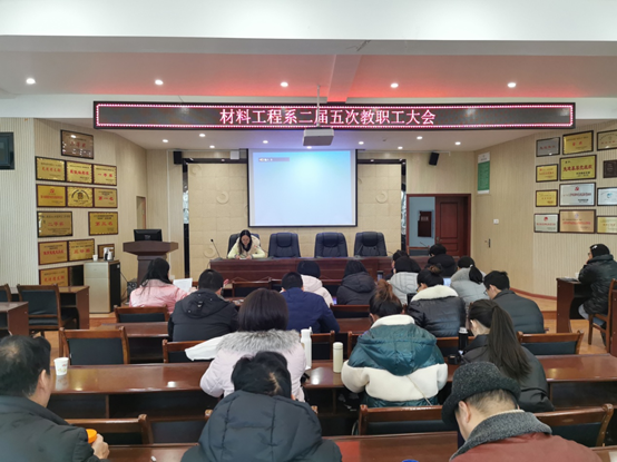 为深入学习贯彻习近平总书记关于“不忘初心、牢记使命”主题教育的重要讲话和重要指示批示精神,进一步加强系部教师师德师风建设,坚持服务基层、服务职工的原则,切实履行工会基本职能,发挥工会组织的独特作用,不断增强职工队伍的凝聚力和战斗力,2020年1月8日下午材料工程系在崇实楼202会议室召开了二届五次教职工大会,材料工程系全体教师参加。会议由材料工程系党总支书记豆祎主持。
