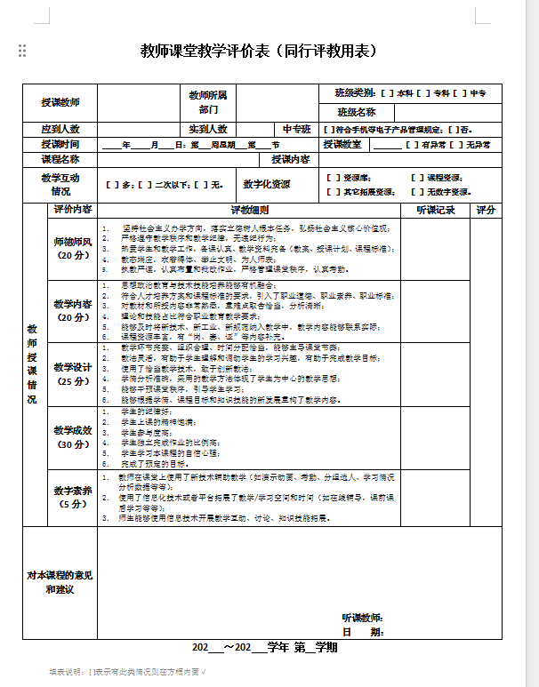 教师课堂教学评价表